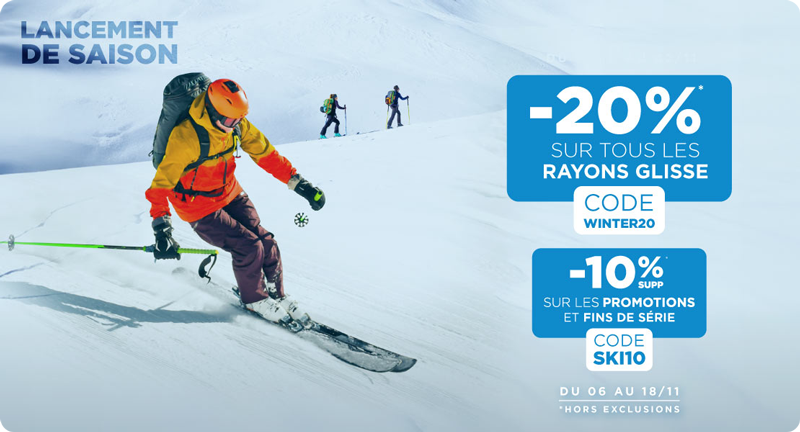 -20%* sur tout l'univers glisse avec le code WINTER20 et -10% SUPP* sur les promotions et fins de séries glisse avec le code SKI10 du 6 au 18 novembre 2025 !