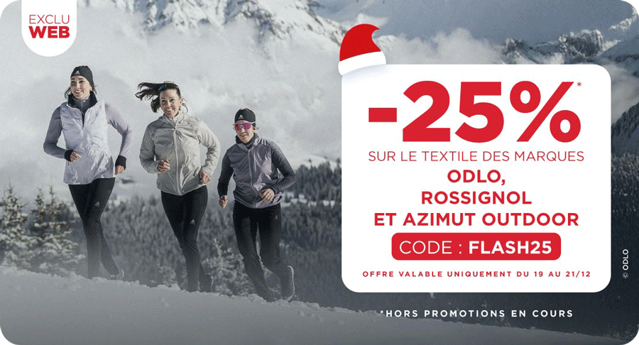 25% de remise* sur tous les textiles des marques Rossignol, Odlo et Azimut Outdoor avec le code FLASH25 du vendredi 19 au dimanche 21 décembre 2025.